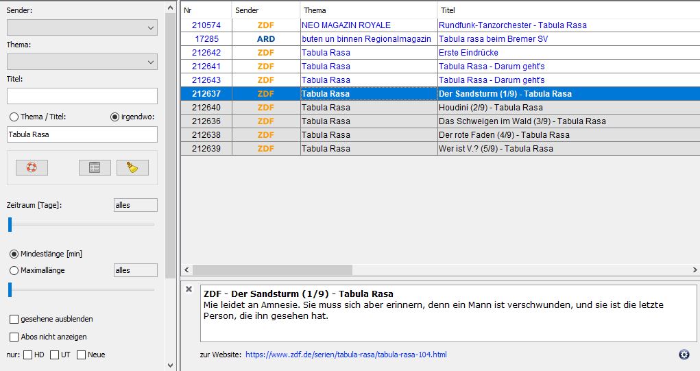 Die komplette Serie wird derzeit auf der Startseite unter der Rubrik “Tabula Rasa - Alle Folgen” aufgeführt. In der Mediathek sind auch alle Folgen abrufbar. Auch nach Löschen der Filmliste im home-Ordner und erzwungenem Neuladen werden in MediathekView jedoch lediglich die Folgen 1-5 gelistet: