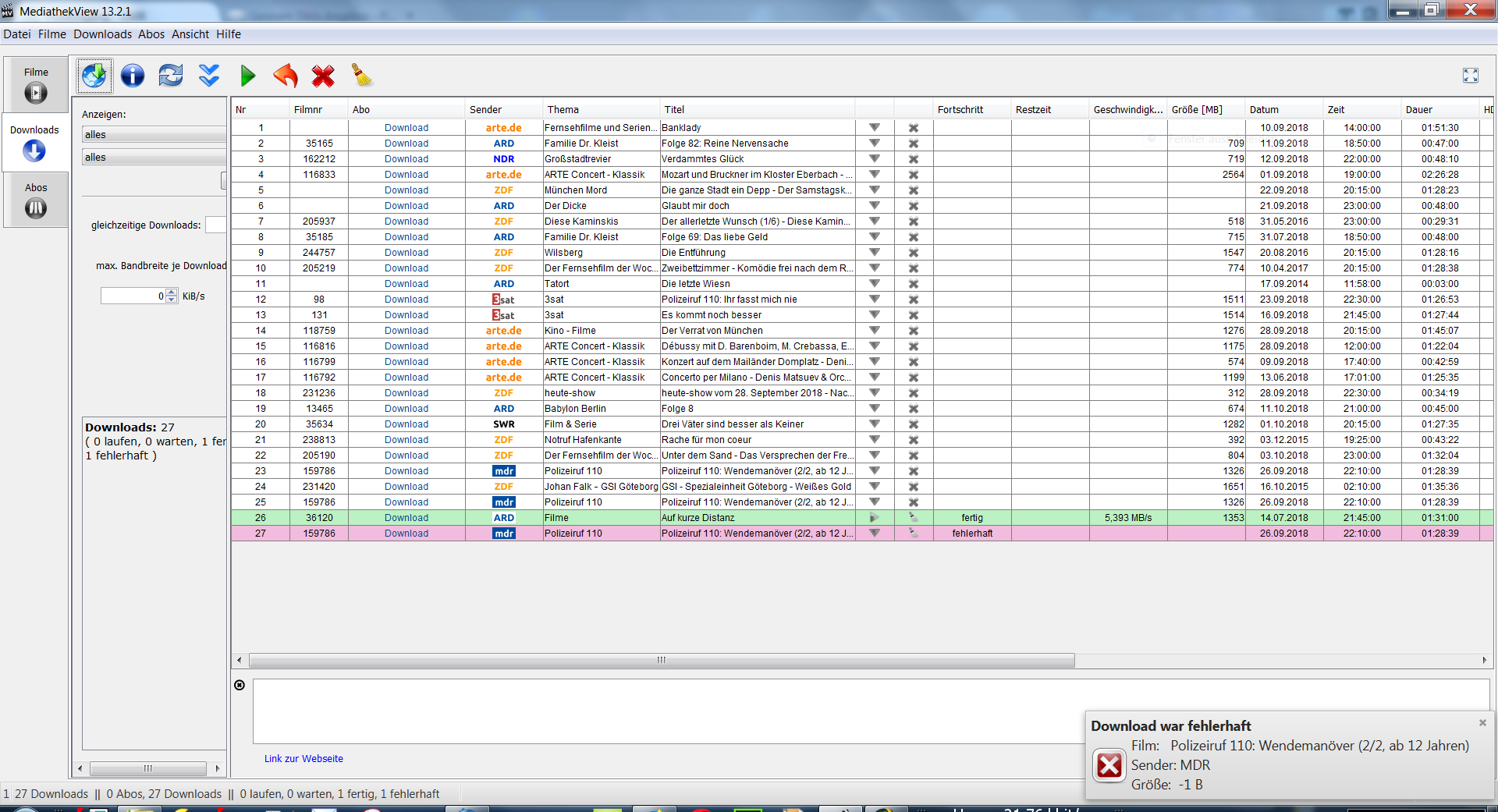 Generell wollte ich aber noch ergänzen, dass Sendungen ab 12 Jahren bei manchen Sendern (z.B. dem WDR) erst nach 20 Uhr herunterzuladen sind. Bei Sendungen ab 16 Jahren sogar erst nach 22 Uhr. Jeweils bis morgens um sechs. In anderen Fällen könnte also auch das die Ursache sein. Bei den meisten Sendern funktionieren die direkten Video-Urls jedoch rund um die Uhr.