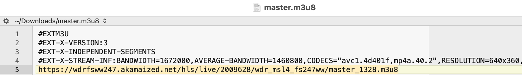 wget https://wdrfs247.akamaized.net/hls/live/681509/wdr_msl4_fs247/master.m3u8 --2025-04-10 04:35:36-- https://wdrfs247.akamaized.net/hls/live/681509/wdr_msl4_fs247/master.m3u8 Auflösen des Hostnamens wdrfs247.akamaized.net (wdrfs247.akamaized.net) … 185.98.140.33, 185.98.140.18, 2a02:26f0:f500:a::1726:7bd4, ... Verbindungsaufbau zu wdrfs247.akamaized.net (wdrfs247.akamaized.net)|185.98.140.33|:443 … verbunden. HTTP-Anforderung gesendet, auf Antwort wird gewartet … 200 OK Länge: 1600 (1,6K) [application/x-mpegURL] Wird in ‘master.m3u8’ gespeichert. ... cat master.m3u8 #EXTM3U #EXT-X-VERSION:4 #EXT-X-INDEPENDENT-SEGMENTS #EXT-X-STREAM-INF:BANDWIDTH=1672000,AVERAGE-BANDWIDTH=1460800,CODECS="avc1.4d401f,mp4a.40.2",RESOLUTION=640x360,FRAME-RATE=50.000,AUDIO="program_audio",SUBTITLES="subs" master-360p-1200.m3u8 #EXT-X-STREAM-INF:BANDWIDTH=6520800,AVERAGE-BANDWIDTH=5640800,CODECS="avc1.64002a,mp4a.40.2",RESOLUTION=1920x1080,FRAME-RATE=50.000,AUDIO="program_audio",SUBTITLES="subs" master-1080p-5000.m3u8 ...und da sind keine absoluten Pfade enthalten. Bekomme ich in Deutschland oder unter Linux etwa andere Daten als ihr?
