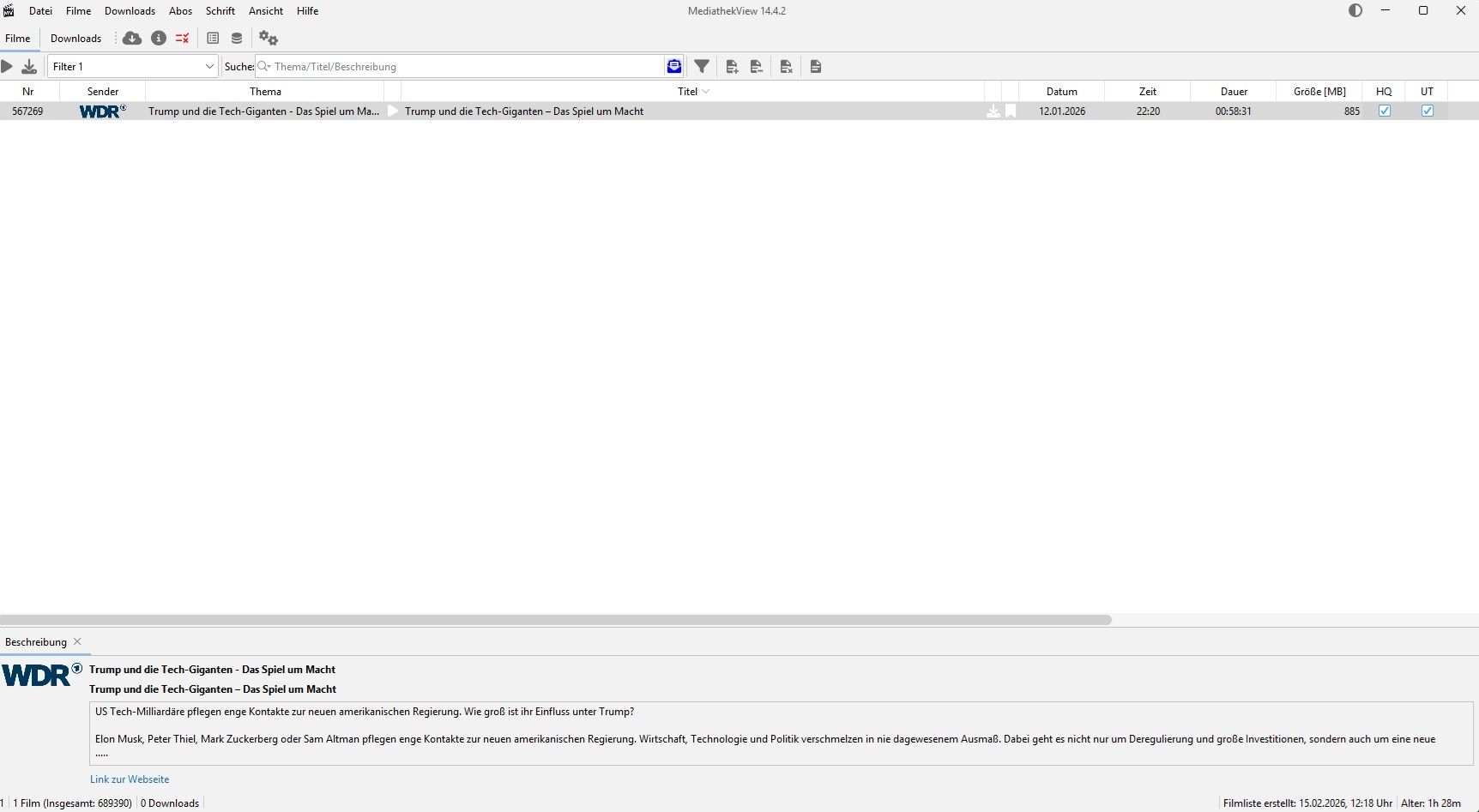 Wenn ich Mediathekview öffne wird keine Filmliste mehr geladen sonder es steht generell nur noch der obige genannte Beitrag in der Filmliste.