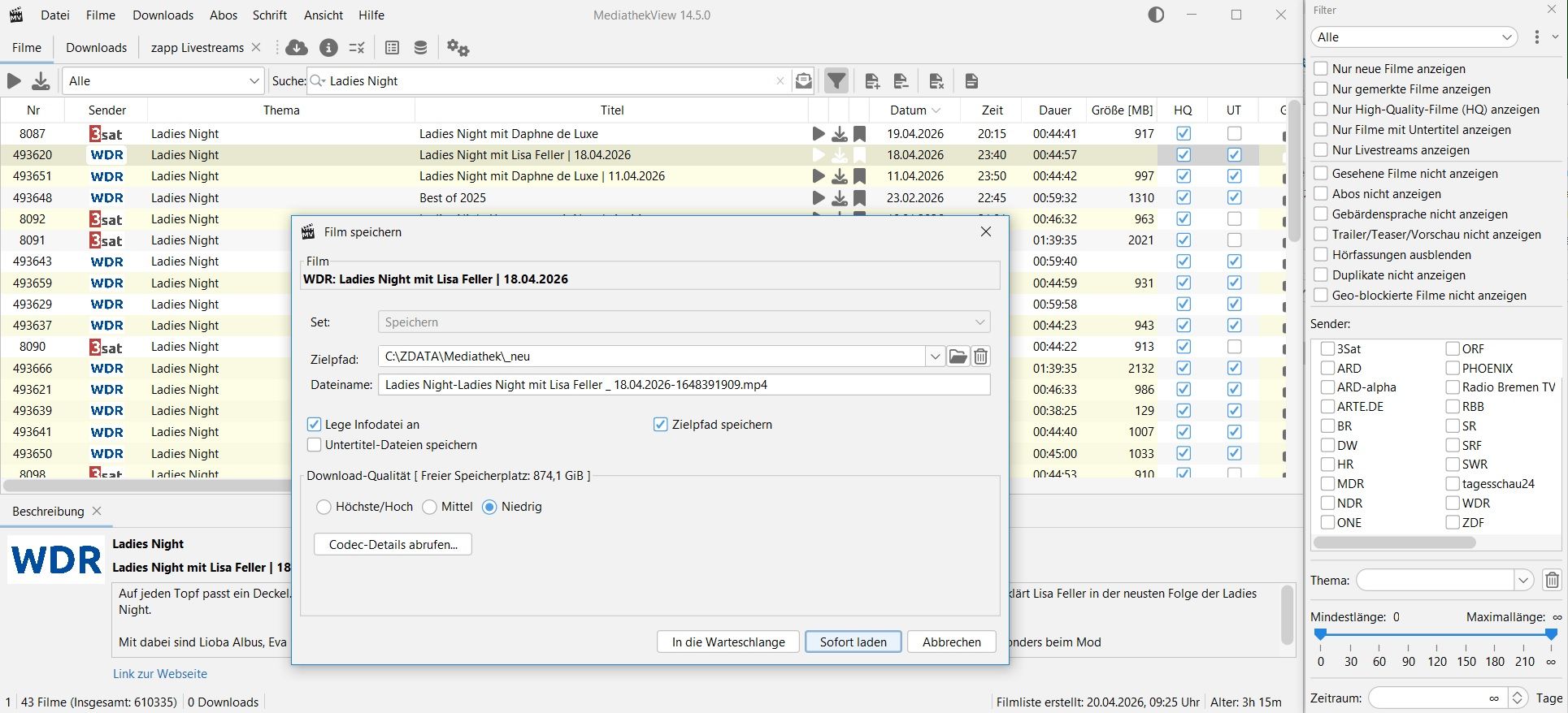 Meistens funktioniert das. Manchmal aber auch nicht. Ich habe das Problem mit Version 14.3.1 festgestellt, aber auch Version 14.5.0 verhält sich diesbezüglich gleich. Es sieht so aus, als ob nur Downloads betroffen sind, bei denen auch die Größe [MB] fehlt. Siehe Screenshot 2 und 3.