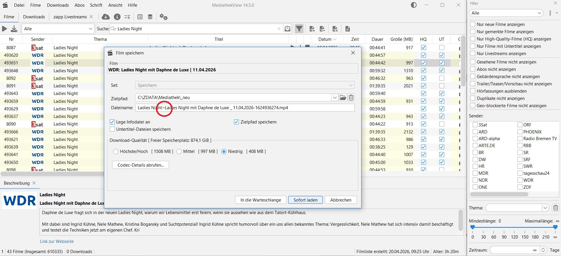 Ich speichere die Downloads zunächst in einem Arbeitsverzeichnis. Dann lasse ich ein Programm darüberlaufen, das mir Staffel und Episode aus dem Dateinamen nach vorn direkt hinter die Tilde verschiebt, ggf auch ein Datum TT.MM.JJJJ nach vorn in JJJJ_MM_TT ändert. Dann werden die Dateien auf meinen DLNA-Server (mein Router mit USB-Stick) verschoben. So kann ich an meinem TV Serien bequemer in der richtigen Reihenfolge schauen.
