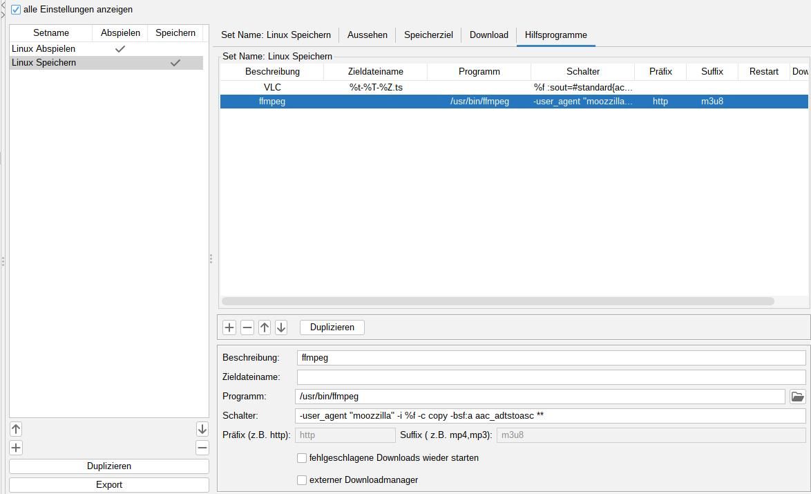 @tvRR sagte: Häufig benötigt das SRF das externe Tool ffmpeg für den Download. Ist das in den Einstellungen korrekt hinterlegt?