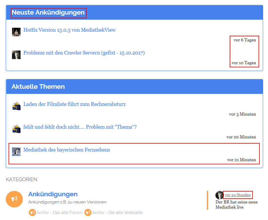 Auf dieser Seite werden an oberster Stelle “Neuste Ankündigungen” gelistet. Diese sind 6 bzw. 10 Tage alt. Rechts unten sieht man jedoch eine neuere Ankündigung von vor 20 Stunden, Thema: “Aktuell keine neuen BR Sendungen/Folgen”. Im Gegensatz zu den anderen oben herausgestellten Ankündigungen hat hier niemand geantwortet, was vor 21 Minuten zu dem neuen Thema “Mediathek des bayerischen Fernsehens” führte.
